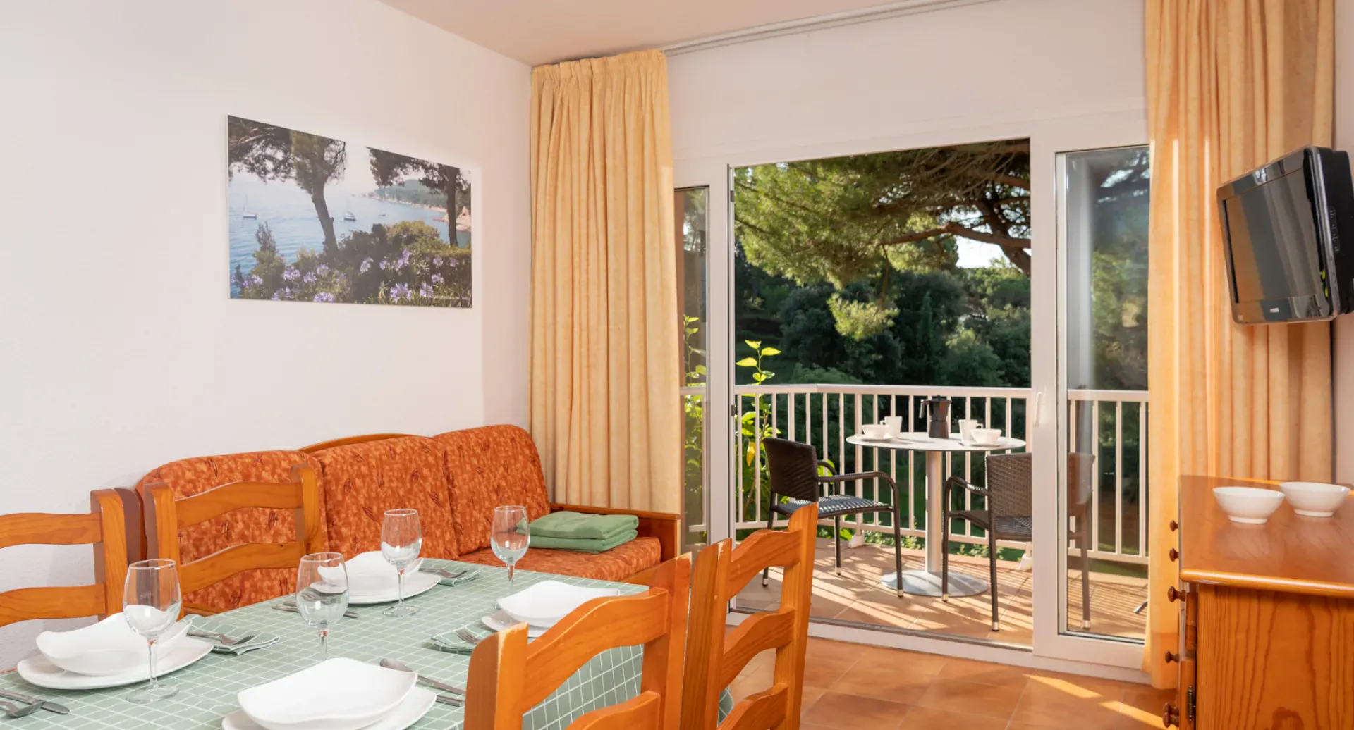 Sie haben ein Doppelzimmer und ein Schlafzimmer mit Etagenbett. Haben direkten Blick auf den Spielplatz und auf dem Meer durch die Bäume.